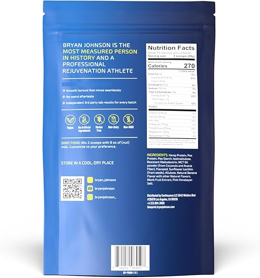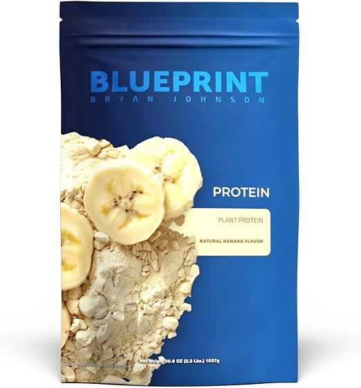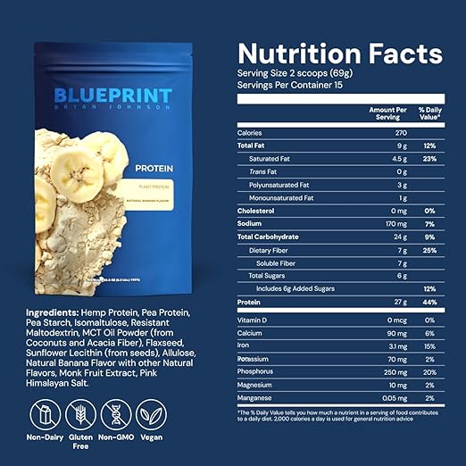 Blueprint by Bryan Johnson Vegan Protein Meal Replacement – Plant Based Hemp Protein with 27g Protein Per Serving – Low Calorie, Flavored Protein for Women & Men – Dairy Free – 15 Servings - Banana