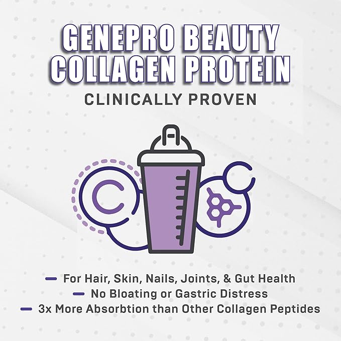 Beyond Hair, Skin & Nails - Collagen is the most abundant protein in the body and as we age, our bodies begin to naturally produce less. Genepro collagen protein powder formula is your ultimate anti-aging strategy to improve hair and nails, skin complexion and elasticity, relieve joint pain, prevent bone loss, promote lean muscle and heart health, and potentially improve mood.